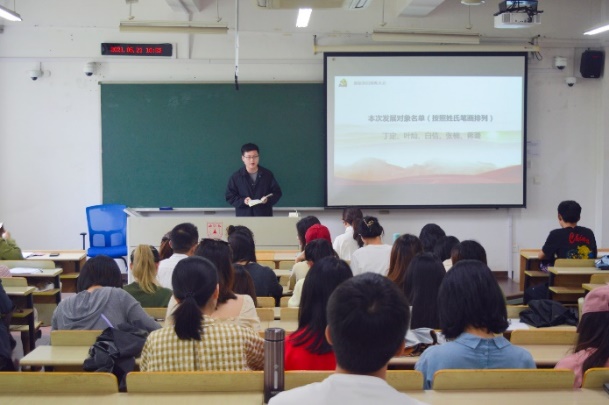 会议伊始,全体起立,奏唱国歌,党支部书记崔兴红汇报到会情况,简短介绍拟接收预备党员情况及程序。会上,第一党支部刘敏璇、陈奇、吴亚秦、徐梦洁、谢敏五位发展对象,第二党支部丁定、叶灿、白佶、张楠、蒋璐五位发展对象分别对党的认识、入党动机、本人履历、家庭和主要社会关系情况,以及需要向党组织说明的问题等方面作了简要报告,同时结合自身实际表达了加入中国共产党的坚定决心和强烈愿望。