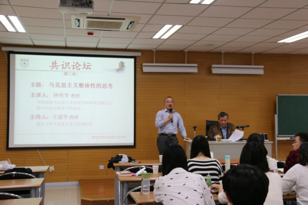 论坛于下午2:00在圣达楼102召开,王建华院长致主持词并隆重介绍了钟明华教授。钟教授表达了对南京大学的感谢,介绍了自己与南大的渊源,并逐次引入到论坛主题:马克思主义整体性的思考。