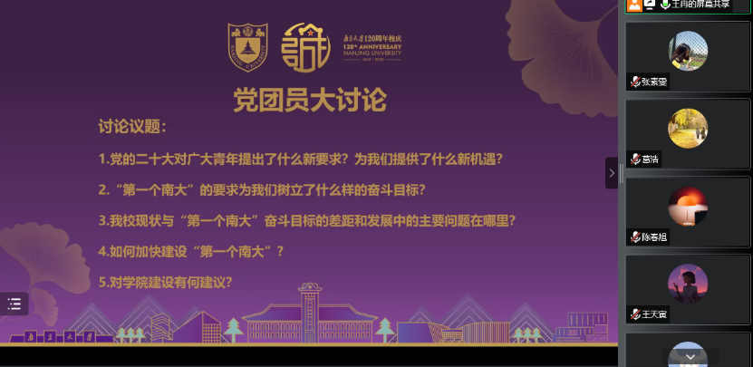 本次学习讨论会还有多位支部党员、团员代表们踊跃发言,纷纷结合学习党的二十大的精神提出了对“第一个南大”建设、学院建设中肯的建议。经过本次热烈而有效的讨论,2020级研究生第二党支部、团支部全体同学们形成共识:即使临近毕业,也必将为建设“第一个南大”贡献作为南大学子的青春之力。